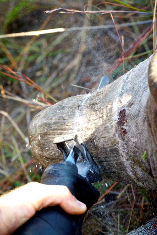 The animal's eyes are covered with a cloth and ears plugged with cotton to protect them from the flying chips of horn as the horn is sawn off.