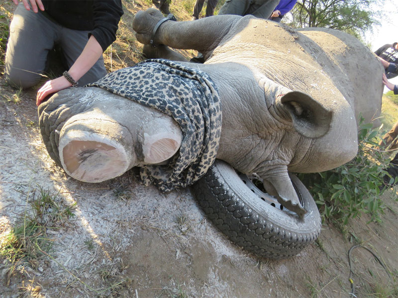 The finished product. Now the rhino has little value to the poachers. In two years or so, the horn will grow back and the rhino will have to be dehorned again.